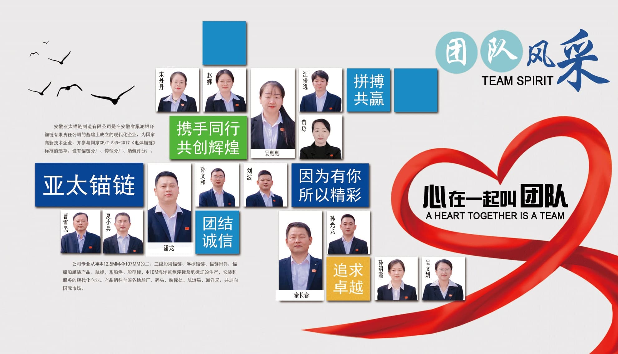 安徽亞太錨鏈制造有限公司是國家高新技術企業,也是國家GB/T 549-2017《電焊錨鏈》標準的起草和制定單位之一。公司旗下設有錨鏈分廠、浮標分廠、舾裝件分廠等多個分廠。公司專業從事φ12.5mm-φ107mm二、三級船用錨鏈、浮標錨鏈、錨鏈附件,錨、船舶曬裝產品、航標、系船浮、船型標、多種規格海洋監測浮標及航標燈等產品的生產、安裝和服務。目前公司的產品銷往全國各地船廠、碼頭、航標處、航道局、海洋局,并已走上國際市場,如東南亞、中東、歐美等國家。